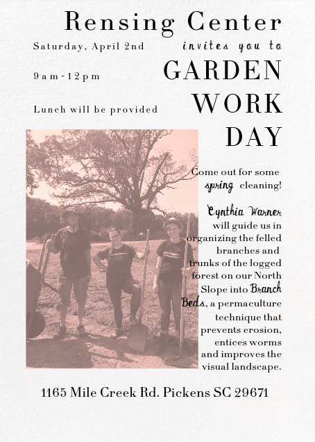 Sunday January 19, 2020 3pm-5pm Rensing Center1165 Mile Creek Road, Pickens, SC 29671 At the Rensing Center, we are focused on… Continue reading Material Mindfulness - Garden Party
