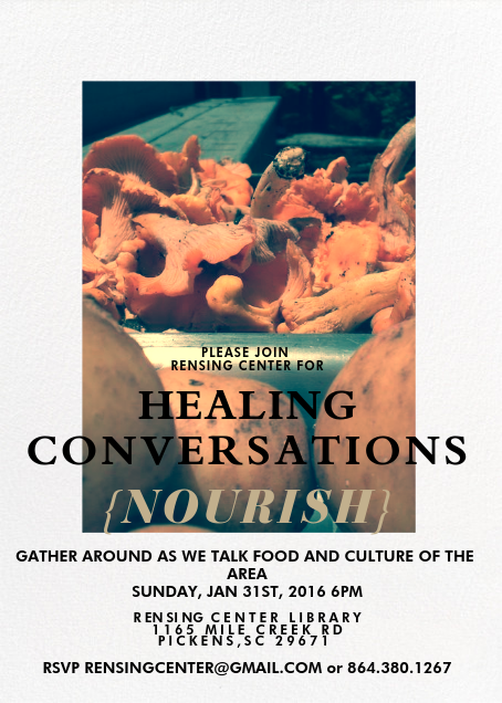 Sunday, February 28, 2o16 at 6 pmRensing Center Library1165 Mile Creek Rd, Pickens, SC 29671Bring food or drink to share.… Continue reading Healing Conversations: GATHER - Healing Skills Workshops